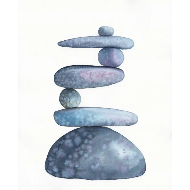 The painting features an intricate pebble tower made up of various sizes of stones. The tower is carefully balanced, with each pebble placed thoughtfully to maintain its delicate structure.