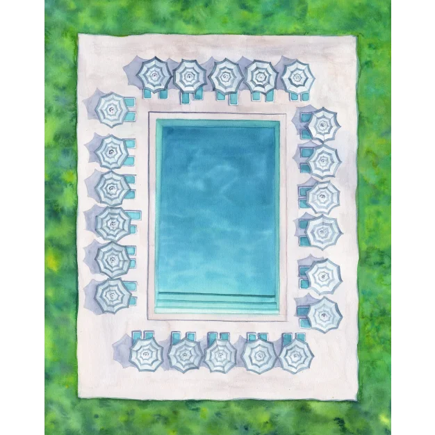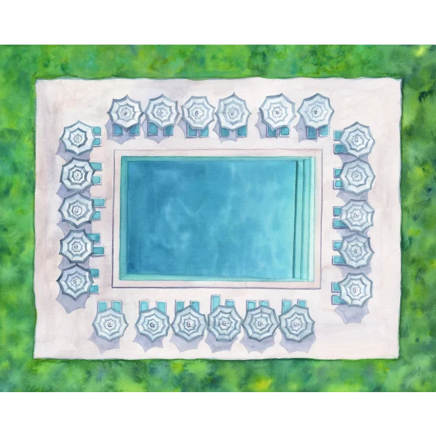 "The start of the season" captures the vibe of a beach resort just before it bustles with guests. In this watercolor, you'll see a top-down view of a calm pool surrounded by comfy lounge chairs and striped beach umbrellas. It's that moment when everything's set up, but the crowds haven't arrived yet.