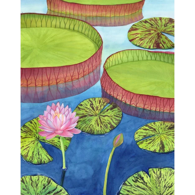 Beautiful pond in a tropical garden with water lily flowers and variegated leaves.